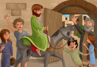 Stad van God. Zo wordt Jeruzalem in de Bijbel genoemd. Met het project ‘Locatie Jeruzalem’ bereiden we ons voor op het feest van Pasen. Tijdens de veertigdagentijd volgen we Jezus op zijn weg door Jeruzalem, van zijn intocht tot zijn opstanding. De eerste zondag gaan we met Jezus, die op een ezel rijdt, en met zijn leerlingen op weg naar Jeruzalem. Dit is natuurlijk het verhaal van Palmpasen, dus dan komen we daar zeker op terug! De zondagen daarna horen we hoe Jezus van de tempel weer Gods huis maakt. Samen met Jezus en zijn leerlingen beleven we hun laatste maaltijd van brood en wijn. We zijn er getuige van dat Jezus gevangengenomen wordt. Drie keer horen we Petrus zeggen dat hij Jezus niet kent. Tot we ten slotte op onze eindbestemming aankomen. Met de vrouwen en Petrus ontdekken we het lege graf. Jezus is niet daar. Hij is opgestaan uit de dood! Al deze bijbelverhalen lezen we uit het evangelie van Lucas. Elke week zal het ook goed zichtbaar zijn, waar in Jeruzalem Jezus is. Ben je nieuwsgierig? We vinden het heel leuk als je komt!
